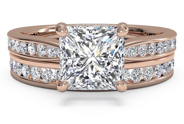 This princess cut engagement ring is unique in rose gold, but the matching channel-set diamond wedding band takes it to a whole new level. The diamonds in each band create continuous streams of brilliance. Channel settings also provide the most safety for your diamonds, with metal edges to protect them from bangs and scrapes. Shop this set.