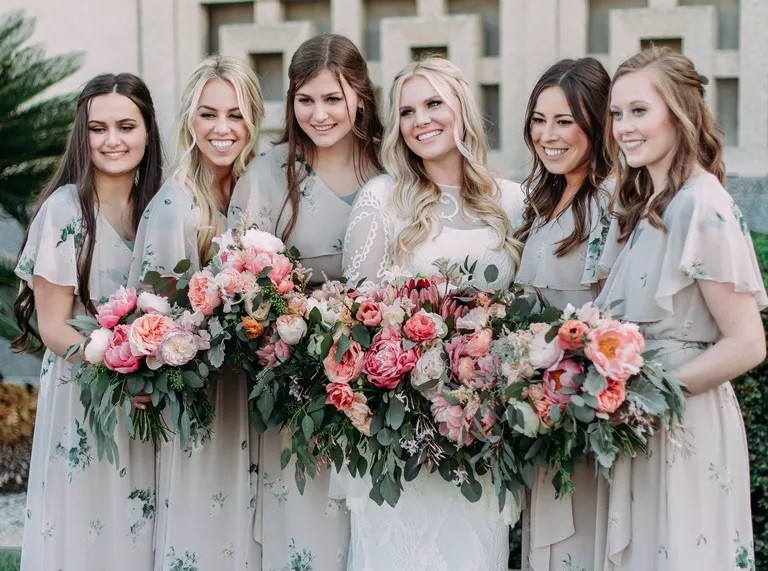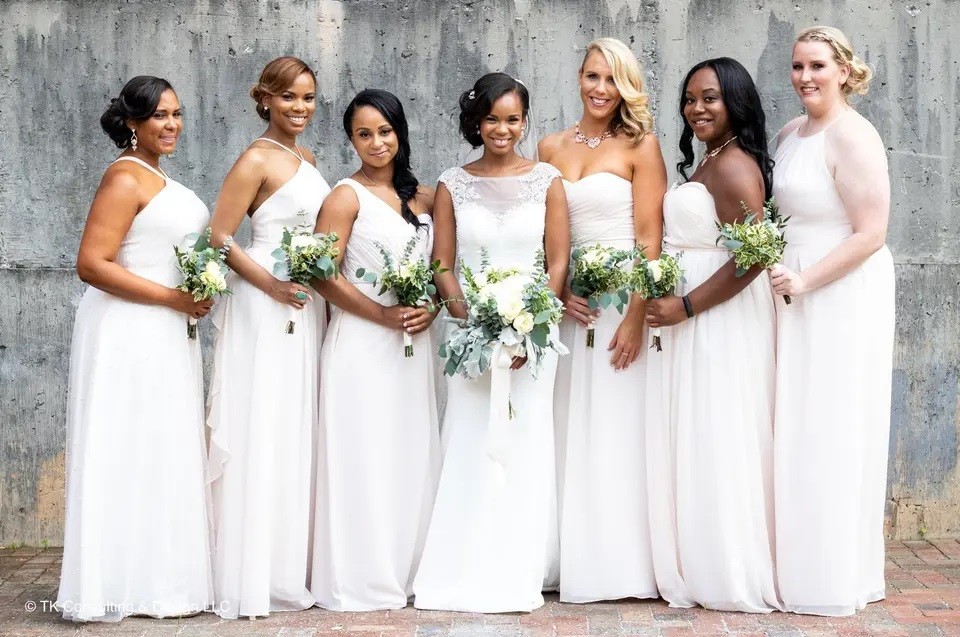These bridesmaids chose side parts and barrel curls as a consistent and flexible hairstyle for diverse hair lengths, styles, and textures.