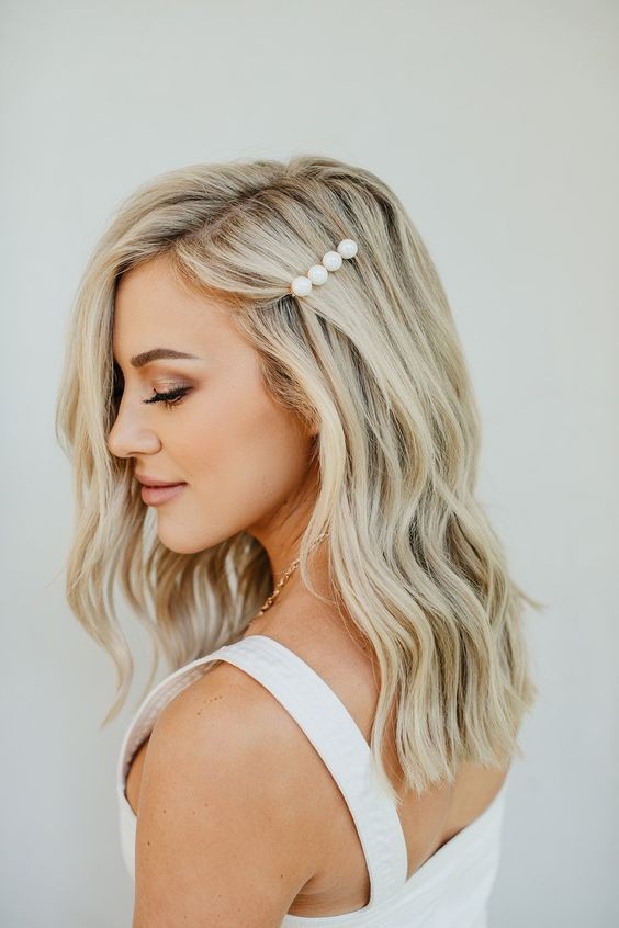 If you love a more minimalistic style, you’ll love this simple bridesmaid hairstyle. A few soft waves and a delicate pearl barrette are all these bridesmaids need.