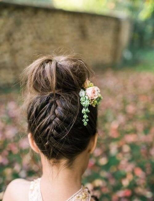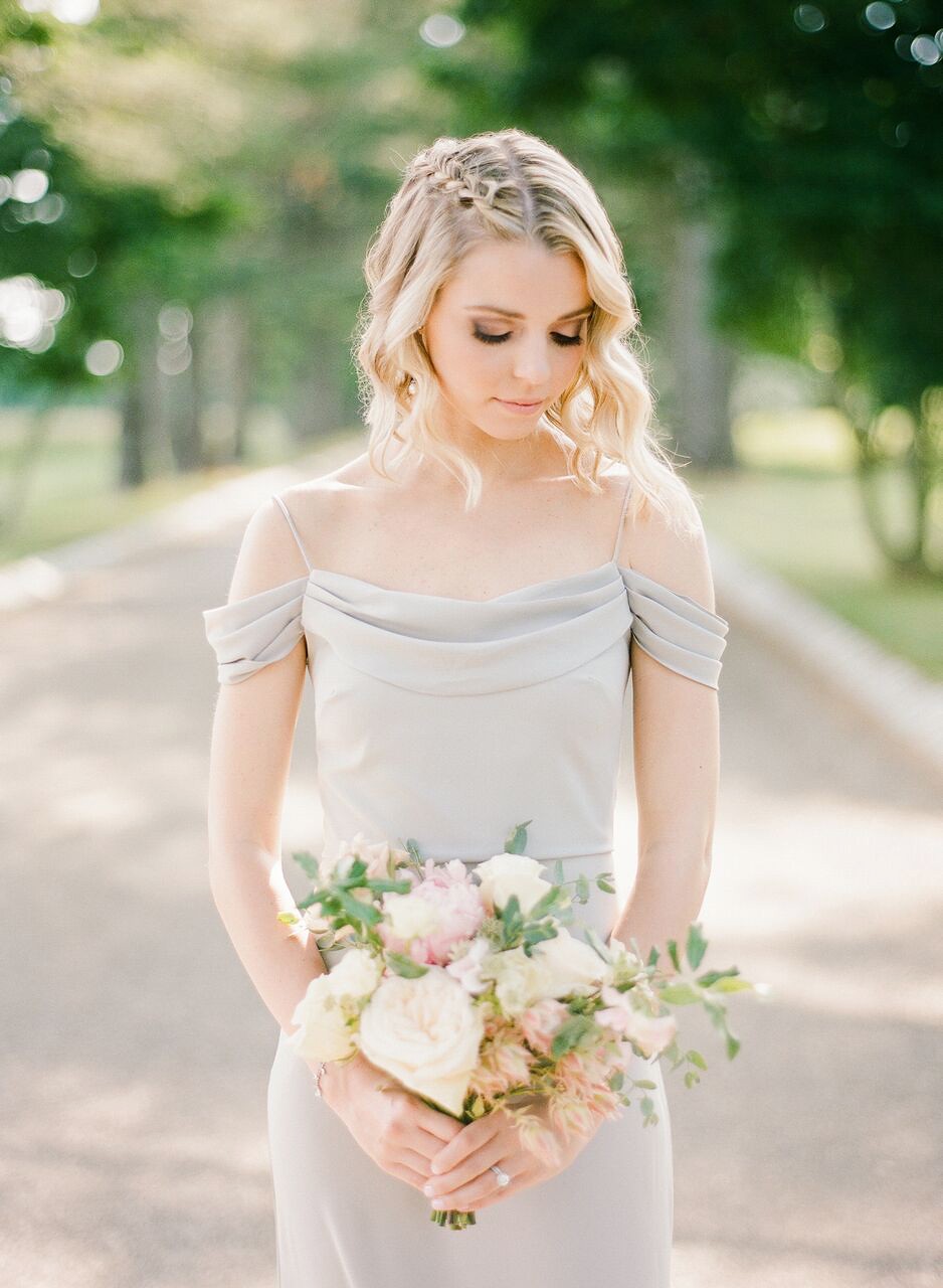 For a sophisticated and sassy hairstyle, wear your braids on top of your head in a high bun. This glam bridesmaid hairstyle is easy to do and will stay put all night, even when you’re busting a move on the dancefloor.