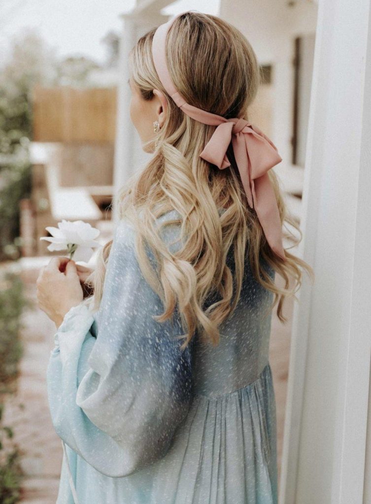 We love this look! It’s simple, elegant, and fun with a touch of whimsy. Create long loose curls, tuck your hair behind the ears, and tie a colorful ribbon into a headband and bow to achieve this look.