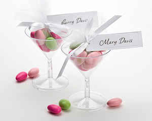 The last example regards nice looking glasses, really tiny that can be used as favors. These can be champagne, cocktail glasses made of transparent material and these can have nice patterns and motifs on them, depending on your tastes…. For instance, you can choose a martini glass made of shiny glass and fill it with colored candy and put also a ribbon on the top with a cardboard that contains your guests’ names and your thankful thoughts.