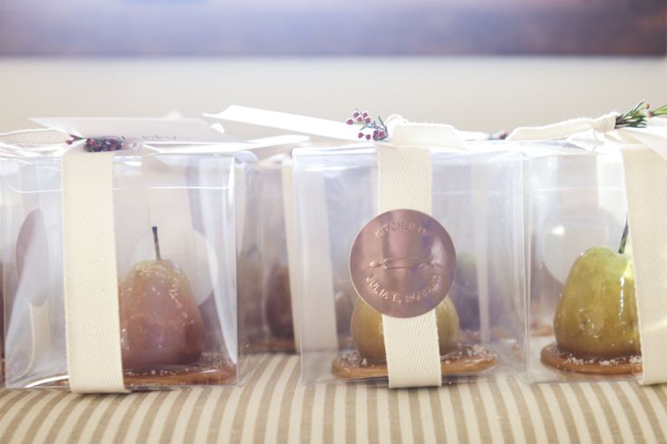 - Bags of miniature pears, of course! Tuck into netting, tulle or even burlap, and attach a “Perfect Pear” tag with names of the bride & groom and the wedding date.