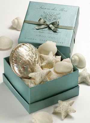 A blue box filled with all kinds of stars, clams and shells made of plastic or porcelain would be also a great idea for a wedding favor with marine theme. The box can have the format of a normal gift box and on top you can place a ribbon with a bow and a “thank you” card. Sounds pretty nice, doesn’t it?