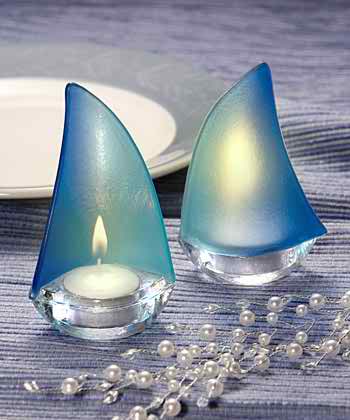 Some candle supports in shape of a sailing boat can also serve as wedding favors. These can be made of blue semi transparent glass and look quite interesting in the same time. We totally recommend these to you and we hope that you find them as special as we do.