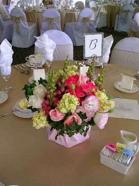 We have another suggestion that you can consider when it comes to a great looking wedding. We’re speaking of a flower arrangement that consists of a small vase wrapped around with shiny fabric and in a pale color.