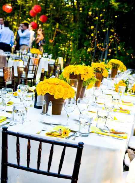 The first examples that we have for you consist of a nice combination of yellow with white. As in, the table cover is white and the napkins together with the flower arrangements are yellow. The pieces of décor consist of pots that are simply filled with yellow roses.