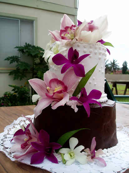 Here’s another nice combination which we couldn’t resist! We’re speaking about a white and black wedding cake that is made of chocolate and in two layers. You can observe tropical flowers on it, made of sweet compounds that is. These flowers are placed on one side of the cake and above it as well. There’s a nice combination of colors like white, black and purple and pink. Indeed, some great looking elements if we come to think of it.