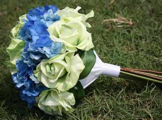 The next bouquet is in white-green with faded blue colors. It is made of one layer of white-green roses and another layer of clove pinks in blue nuance. There are two lines of roses and only one consisting of the blue flowers. The bouquet has at the basis some green leaves, really intense and ends with really long strains.