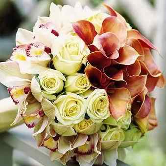 We end for now with another great looking model of bouquet, which is made of three types of flowers. The basic layer is made of orchids, the next of roses and the last, meaning the middle one is made of callas. You can observe just how marvelously these flowers are combined and the basic color is a warm one. You see how the orchids and the calla have similar colors and the roses in the middle seem to be a passage between the two types of flowers and colors.