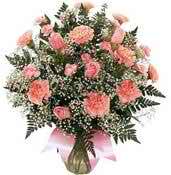 We continue with another great looking bouquet, which is a great combination of green and pink flowers. The pink flowers are both roses and clove pink flowers. A row is made of the two flowers combined together and creating a multicolored line. Here and there you can find big white pearls put, which create an interesting visual effect. At the basis of this Biedermeier bouquet there is a layer of ferns, which comes and completes this beautiful accessory.