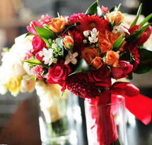 The first bouquet we want to present you has at the basis red as a color. It is composed of numerous species of flowers: red roses with orange ones, but in really small buds, there are also red chrysanthemums with daisies also in red, carnations here and there and some other white flowers. This looks rustic because of the combination of the flowers; these look like in an unorganized garden, but certainly create a great image together….
