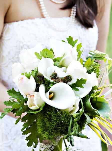 Here’s another gorgeous combination of tones that we have in the following lines and we’re certain that you’re going to find it pretty interesting. So there’s this combination of white callas with roses and green plants attached. It’s indeed a striking combination- the string green tone with white….