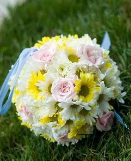 We continue our list with a bouquet that recollects only colorful flowers…. There are yellow and white daisies, pink roses and some other flowers that come and complete the palette of colors. The spherical bouquet is tied with a blue ribbon with the help of which you hold the bouquet in your hands. This bouquet will serve marvelously as an accessory for the maids of honor and you can be sure that it will match in color with all of their dresses.