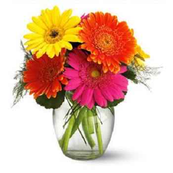 Take a transparent glass vase and fill it with water. Place some great looking daisies in spicy tones in it and add some great looking green plants as a final touch. The result: a neat wedding flower centerpiece that will catch everyone’s eye.