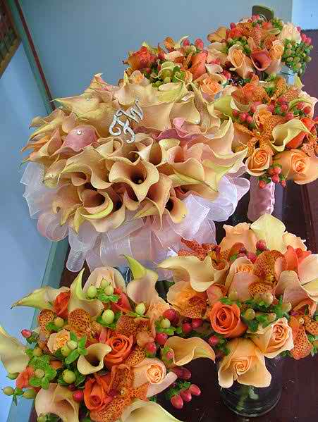Here’s an orange wedding bouquet that is made of pretty flowers, like callas, the bride’s flowers and here and there are some other used in darker color tones. Also, another thing that you can observe concerns the fresh leaves that are noticeable here and there, to which there are added some really faded green plants that create an interesting visual effect.