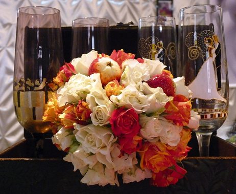 We have another combination of elements and flowers that we want to mention about: it’s a white and orange bridal bouquet that is made of roses and some other flowers, exotic ones. This bouquet is rich as well and we’re certain that it’s going to please your eye from the point of view of the colors used and the fact that it’s really rich in flowers. We hope that you enjoy it pretty much and that you consider taking it into account, because it’s going to be a really interesting idea to apply for.