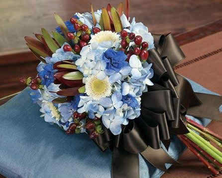 Search and buy similar productsHere’s how a change intervenes when it comes to winter flower arrangements and there’s another color that appears and in this case it’s the blue tone. So, how about a winter flower arrangement realized in white, blue, green and red? Certainly if you pay attention to the details and flowers used in it you’re going to observe that it’s appropriate for the occasion and time in which the wedding takes place. So, here and there between the blue flowers you can observe mistletoe and green plants. The most important detail seems to be oversized bow made of a shiny ribbon in a dark green tone. Interesting details indeed!