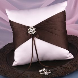 You can have a satin brown pillow and place a semi transparent fabric on the outside! On one corner place a nice flower made of marbles and ribbons and put the wedding rings in the ribbons, and that’s it!