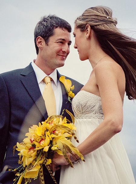 If you want to make it appropriate with the groom as well, you can definitely take into account wearing a tie and a flower detail on the chest, like a yellow calla.