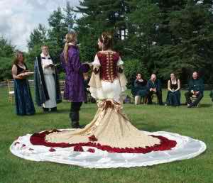 The trail of this dress is really long and certainly will invoque the idea of fairy tales! The basic material used for this dress is tulle over silk! The groom wears wool and silk smoking, with a white elegant shirt made of cotton! The costume is black and it has on the collar red silk applications!