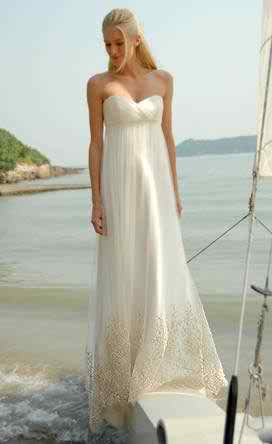 Our next proposal of beach wedding gown is for a strapless model with straight neckline. This one is really long and it has embroidery on the margins. Quite a nice visual effect if you come to think of it, isn’t that right? So, this dress is really tight on the bodice up to the waist area and from that area it begins to be loosened and loosened. Let’s also mention that the skirt ends in the back with a rather long train and we hope that this isn’t a problem if the wedding takes place on the seaside.