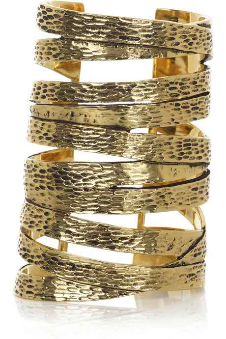 Here’s how we continue with some other suggestions and we recommend a cuffed bracelet that is wrapped all around the hand and it’s made of similar patterns as those of a snake skin.