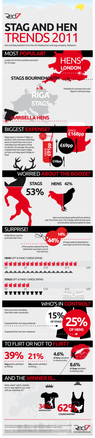 Here at Redseven we recently ran a survey to find out all the gossip on stag and hen trends for 2011. We asked over 2,400 hens and stags a number of questions from what they spent they spent their money on and where they visited, to which celebrity stag and hen parties they’d like to have recreated.