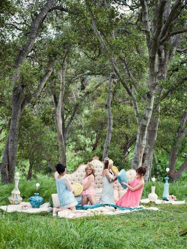 Good, clean fun! Ask guests to dress in their favorite jammies. Have tons of super-bad-for-you snacks, chick flicks, board games, etc. Comon – you remember how this is done!