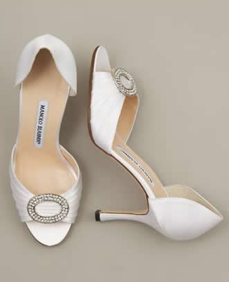 This pair is made of satin and it has a jeweled brooch detail in the front side with pleated vamp. The heel isn’t that big and it’s covered almost entirely with leather. Should we mention the designer? Well, you must have a hunch definitely, Manolo Blahnik….
