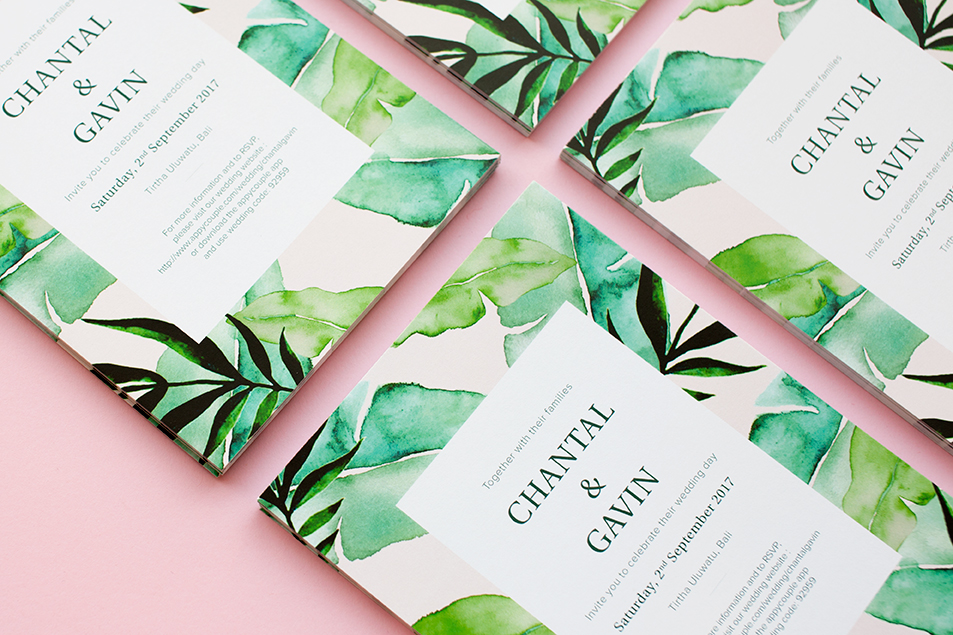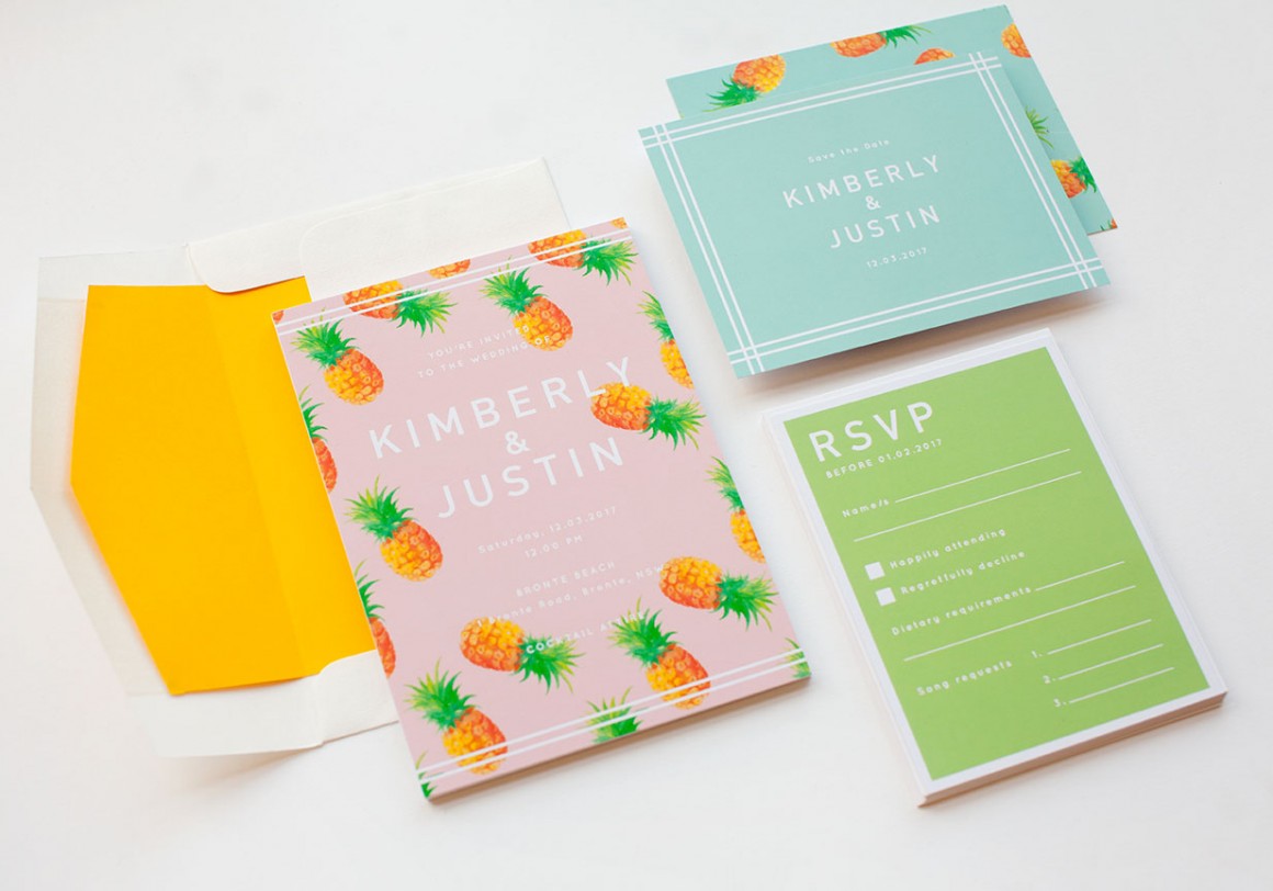 The beach in summer just screams ‘tropical’, even if you’re not actually in a tropical location. For this reason, tropical themed wedding invitations are a great fit! Think lush green palm fronds, tropical flowers (frangipani, hibiscus), tropical fruits (pineapple, melon, banana) and lots of bright colors. You can keep it subtle with lots of leaves and greenery, or go all out with a pineapple pattern.