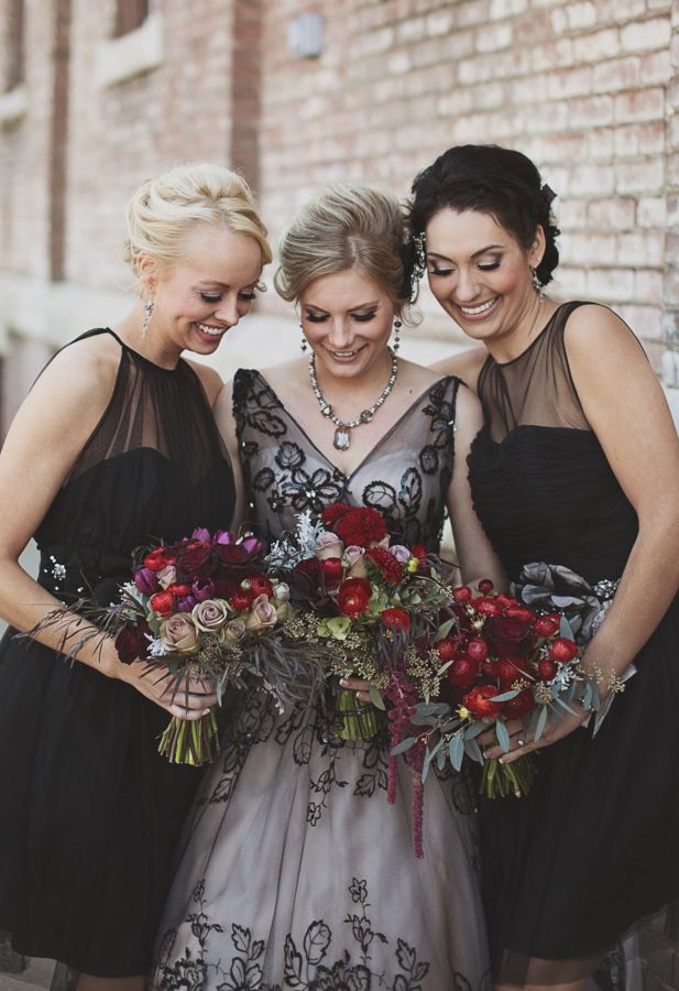 Slim fitting black, red, orange or yellow dresses with matching capes. Instead of a regular neckline, consider having a seamstress add a high, stiff collar to frame their faces. Use tiaras in their hair, or matching ribbons. Outfit your bridesmaids in black (much more popular these days, even at non-Halloween weddings), burnt umber or cranberry. Accessorize with arm-length opera gloves, or short lace or crochet hand gloves. Find or make yourself a spooky bridal hat with roses, ostrich feathers, and netting.