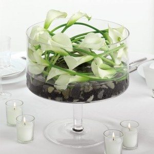 We struck over an interesting floral arrangement that has at the basis ideas like light and semi-vivid nature. Take a cylindrical glass vase, which is transparent. Fill this container with calla flowers making sure that they create semicircles with their strains and their flowers are somewhere above! Place these containers into the light and you’ll see the effect created! At the basis of this cylindrical vase you can put also some grass threads in order to make it look much interesting.