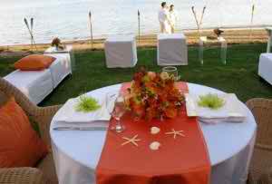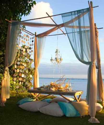 Another example for the matrimonial table regards a nice spot, delimited with four wooden poles. On these poles you may place some transparent cloths that will assure you the right atmosphere. Besides theme you may place a chandelier in the middle upper side. Don’t use chairs! Use blue and white pillows around a rectangular wooden table. On this table you can put some elements that bring you with the idea of sea and marine elements. This nice arrangement should be made in a comfy area and make sure you see the seaside!