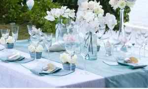 The next suggestion denotes refined taste and exquisite look. You have a white table cover with a marine blue part on the middle. The plates can be made of a transparent material and in each one of these you can have a silvery shell that remembers your guests the theme you’ve chose. You want to create a vivid watery image and for this you should use only accessories made of glass or transparent materials. For instance, you can have a glass vase with whit flowers in it and crystal glasses.