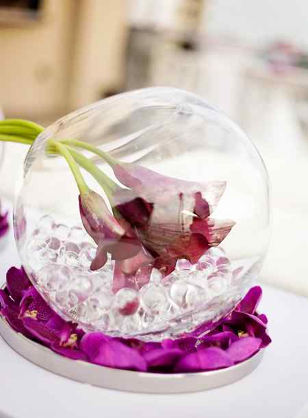 Here’s how we continue our list of suggestions with another neat looking white and violet flower arrangement. This one consists of a transparent bowl that has at its bottom some glass marbles. Also, at the basis of this bowl you can observe some violet flowers that stand as a carpet for this neat looking arrangement. Inside this bowl there’s placed a purple flower that looks as interesting as the flowers placed at the bottom of this arrangement. We’re sure that you’re going to enjoy this flower arrangement pretty much and that you consider in applying for it in your wedding day if you apply for a white and purple wedding.