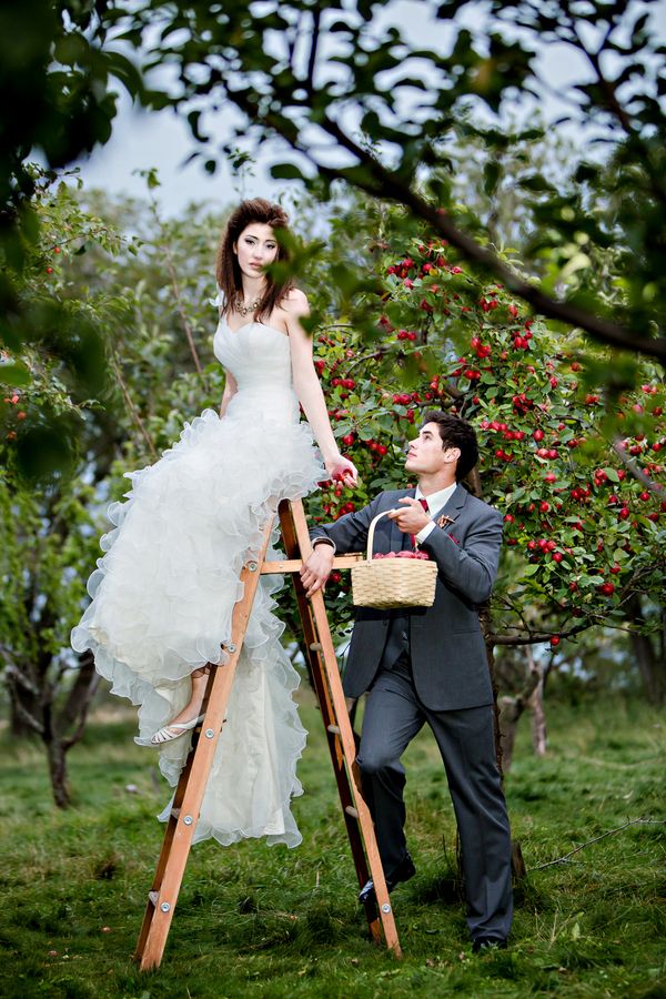 Apple of My Eye. This theme goes hand-in-hand with autumn weddings, but there’s no reason why you can’t take your apple-themed wedding in other directions, too. Outside of the fall feel, we see more and more apples as florists and designers “modernize” their creations with fruits and vegetables, succulents and herbs. But let’s start with some autumn-style apple ideas …