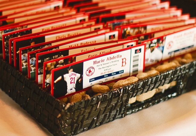 If your guest list’s intimate, offer up baseball caps for your beloved Cubs or Red Sox on a table near the door. Or, old-fashioned Crackers Jacks in the boxes makes a head-turning treat.