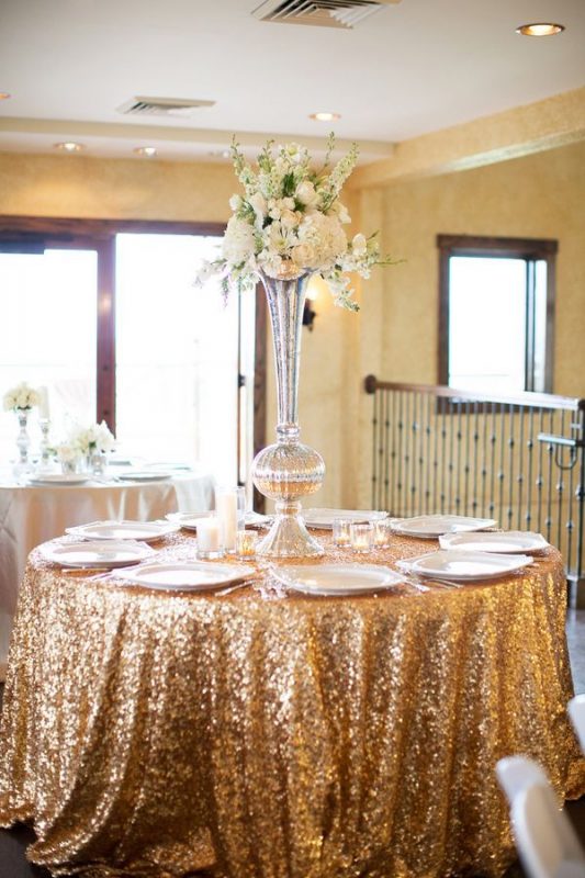 Of course you can accent your reception tables and centerpieces even more perfectly with a tablecloth full of sequins.
