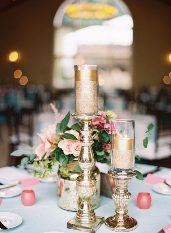 But if you’re going for a more romantic and modern look, these stick with classic staples like glass vases and floating candles – and glitter too.