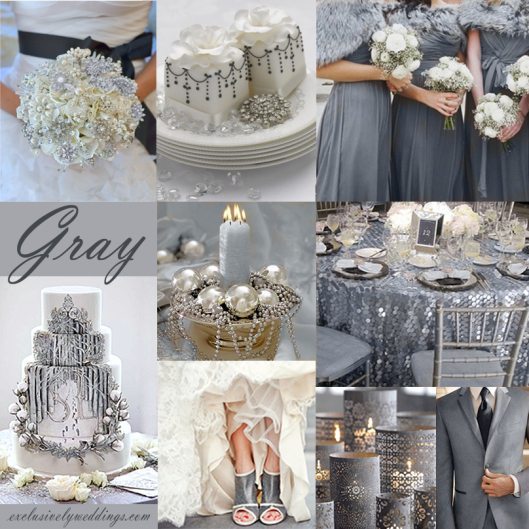 To exploit gray’s modern feel in your wedding, start by layering it in your fabrics, such as table linens, and the bridesmaid gowns. A dove gray or pewter makes a chic and minimalist choice for your attendants. Soften gray’s austerity by choosing a softer material like chiffon or organza, or add drama with a hint of shimmer.