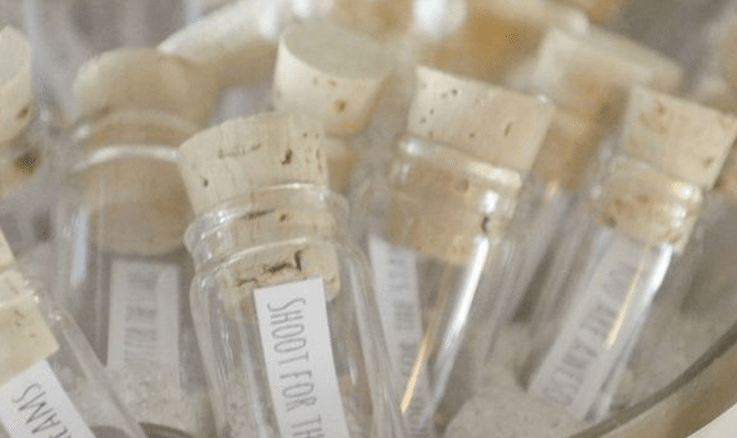 What’s more, she says, they actually mailed these invitations directly in the bottle, with “To” and “From” labels attached. “The post office allows it,” she said. “I had no clue we could do this, but my mother-in-law tipped me off.” (Editor’s note: this is where purists can really see the advantage in plastics.)