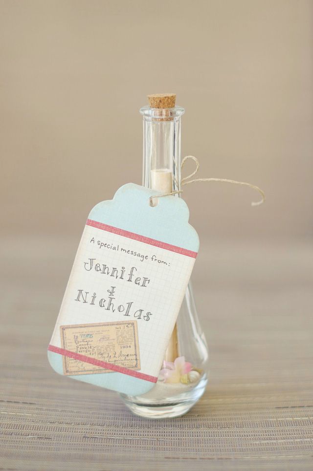 This alone makes a beautiful invitation, but you can personalize it even more by making a custom label for your bottles … perhaps including a photo of you and your sweetheart, for those far-away relatives who haven’t seen you in a while. Or consider adding a pinch of essential oil or fragrance to your sand and shell inserts. Choose something bridal (freesia) or tropical (coconut). As long as it’s not overwhelming, it could be powerfully evocative.