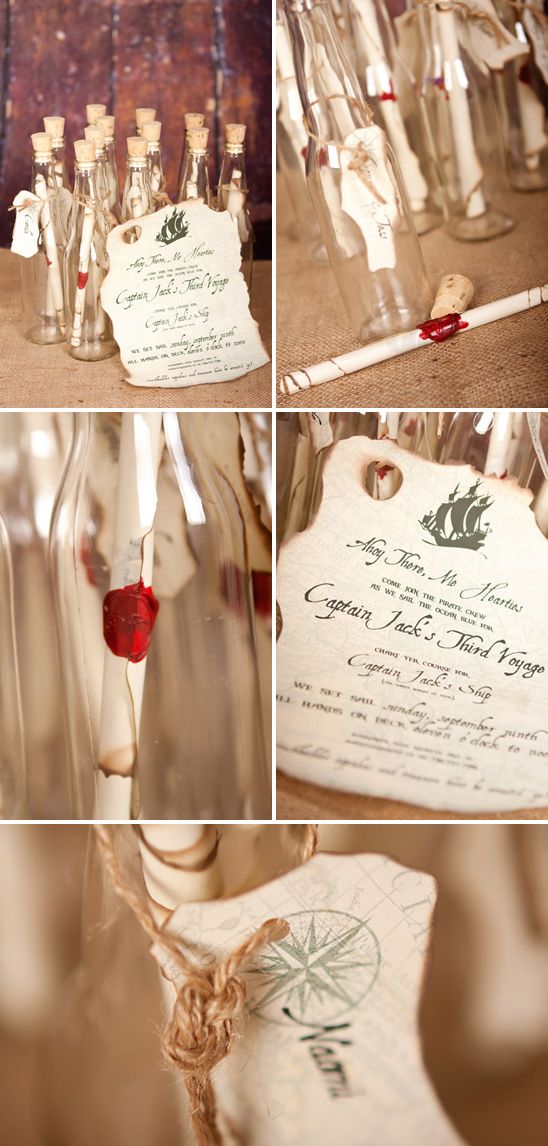 Of course, you can also add your own custom touches. For example, you might include a map with torn, charred edges (like the pirate maps of old). Or instead of just tying your invites closed with a cord, you could use a satin ribbon and a wax seal.