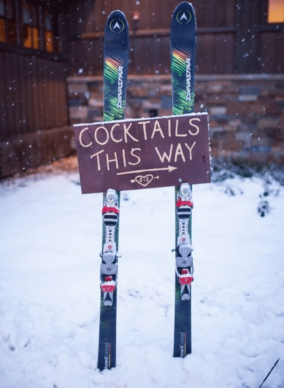 Try to find a venue that does a lot of your work for you: tall, chateau style windows, and lots of interior wood and stone. Big, loosely-grouped overstuffed chairs say “ski resort.” So does a giant faux-fur rug, if you can get your hands on one.