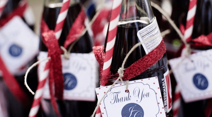 Certain areas at the reception just beg for a little humor. Signature cocktails are one. Why not treat your guests to a few hundred glasses of ice cold lemonade? Make it special by serving up half red (made with raspberries and a splash of vodka) and half blue (made with blueberries and blue curacao). Garnish each drink with the appropriate berries and a sprig of fresh mint.