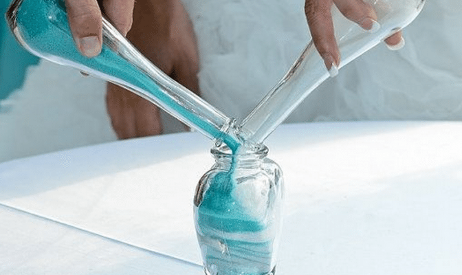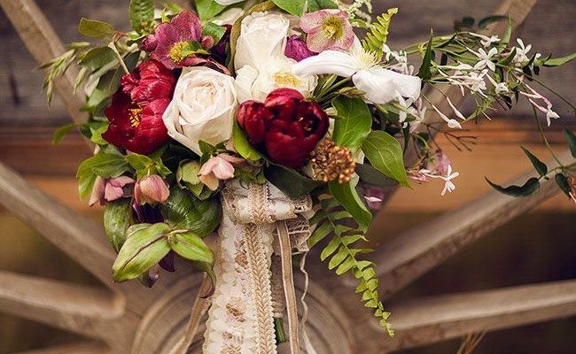 When it comes to florals, go sweet and classic (yellow roses, anyone?) or casual wildflowers. But make your mark with a western bouquet wrap, whether it’s a red and white silk bandana or a leather strap. Another popular option for on-the-range nuptials: tie a lucky horseshoe to the bride’s bouquet. But tie it upside down so luck can “fill it up!”