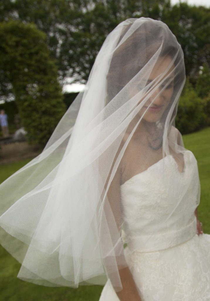 There is nothing wrong with a tiny bit of sparkle in the wedding veil for a morning or day time affair, but save the bling wedding veil for the evening.