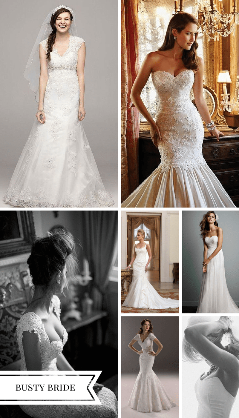 …go for a dress with a scooped neckline. This opens the face and displays the décolletage without revealing a ton of cleavage. If a fan of strapless gowns, opt for one with a sweetheart neckline over one that goes straight across. The latter will make the bust look even bigger, and worse, shelf-like. Also keep in mind that ruched bodice fabric or that with a sheen will add volume and once again call attention to the chest.
