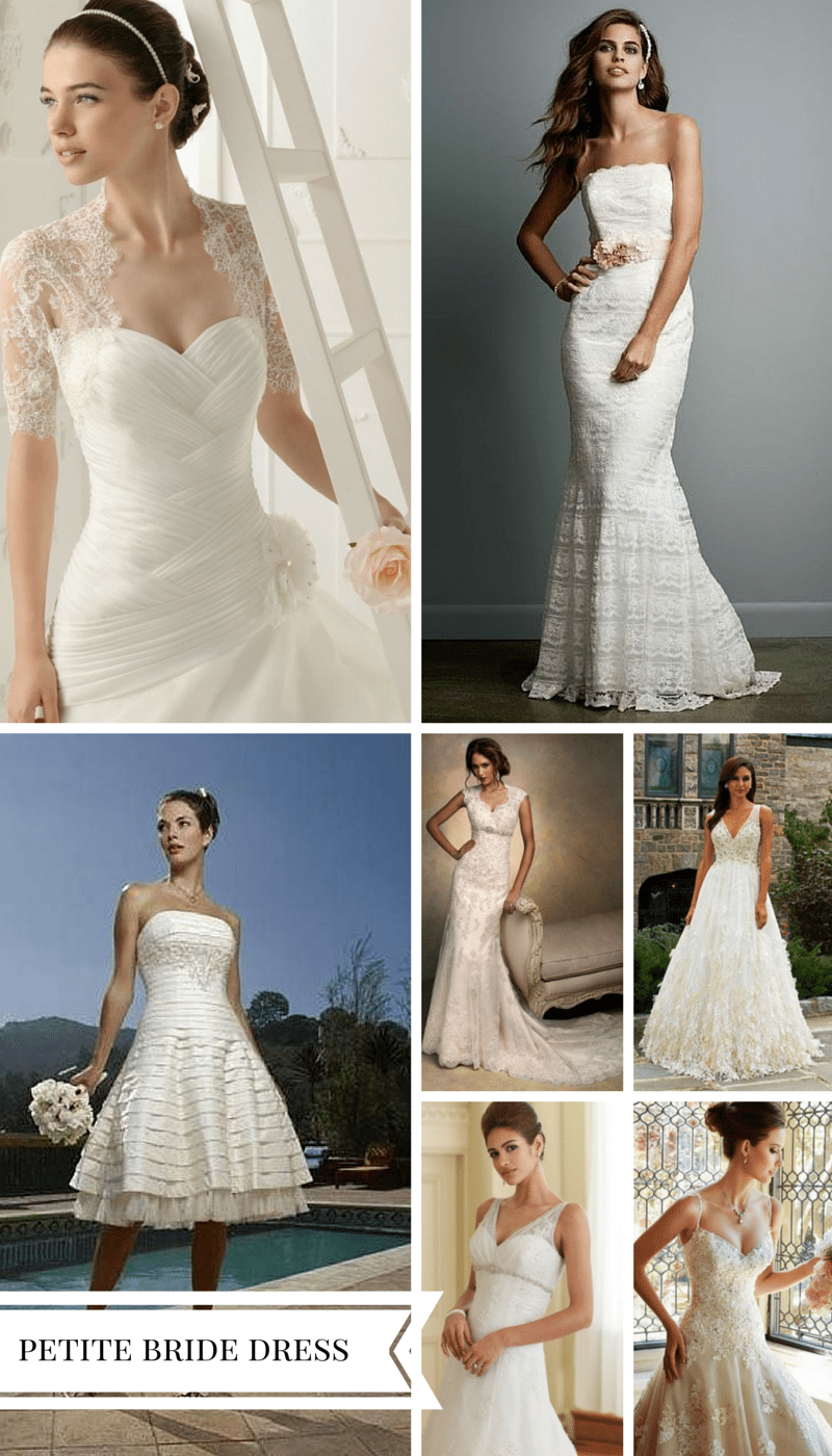 …look for trumpet, modified A-line, and sheath gowns. Find a style with a waistline above the natural waist to make the lower half of the body appear longer. While detailing should be small and limited to the bodice, any fabric will do, including shinier options. Stay away from dresses with a dropped waist, which make legs go bye-bye, and ball gowns, which swallow small figures. Anything calf-length makes the legs look short.